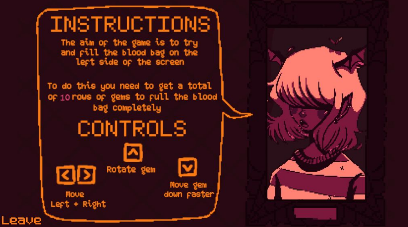 Your vampire friend needs you! Her lifesaving blood stash is running low! Drop, match, and rotate blood gem blocks in a classic Tetris challenge to keep her alive. Each row cleared helps replenish her supply. Will you help her?